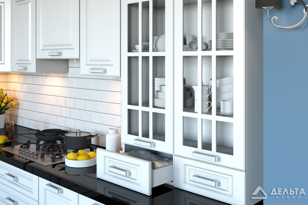 Кухня «Палаццио» в неоклассическом стиле сохраняет сдержанный и благородный характер классицизма: все пропорции чётко выверены, компоновка кухни сбалансирована и подчиняется законам симметрии. В тоже время вся композиция необычайно легка и изящна, в ней н