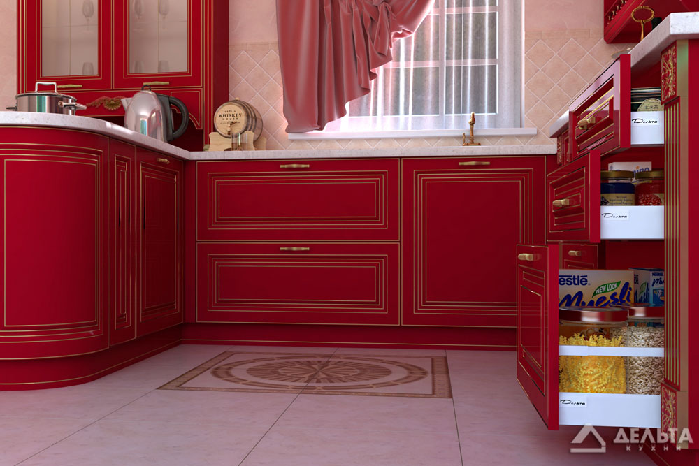 Утонченная кухня, выполненная в классическом стиле «Ампир». Строгость форм фасадов и витражей, выдержанность в планировке позволяют создать на кухне атмосферу уютной респектабельности. Правильные, даже геометричные линии фасадов подчеркнуты изящной пати